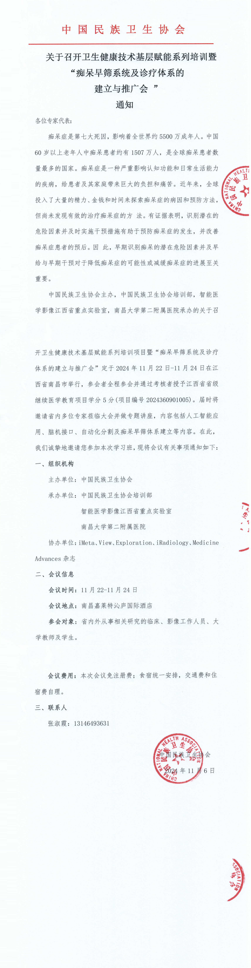 关于召开卫生健康技术基层赋能系列培训暨 “痴呆早筛系统及诊疗体系的建立与推广会 ”通知