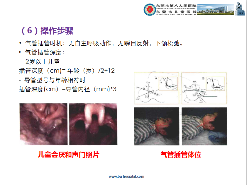 RSI实施方法:在为⼉科患者进⾏RSI时,各个步骤依次为:准备、预吸氧、予以预处理药物(可选)、镇静和肌⾁松弛、气道保护和体位摆放、气管内插管并确认位置,以及插管后管理。1、准备:在RSI的准备阶段,临床医⽣必须根据患者的临床情况快速制定插管治疗计划。此步骤应在患者接受预吸氧时完成。准备的主要内容包括相对禁忌证的评估和物品准备。可制定插管核对清单,包含的条目有患者评估、需要的设备和药物,用于减少RSI期间发⽣错误的机会。2、预吸氧:一旦患者有需要⽓管内插管的表现,即应尽快使⽤100%氧⽓预吸氧2分钟。预吸氧可在患⼉的肺内建⽴氧⽓储备,同时使全⾝的氧过剩。随后患者就能耐受较长时间的呼吸暂停⽽不会发⽣去氧饱和,给插管留出较为充分的时间。3、预处理:(1)1岁以内给予阿托品;(2)常规应用阿片类药物镇痛,如芬太尼;(3)可能有颅内压升⾼的⼉童可使用利多卡因。4、镇静和肌⾁松弛肌松药和诱导镇静剂是RSI的两种必需药物。镇静剂必须先给,国外推荐依托咪酯或氯胺酮,国内常用咪达唑仑;患⼉无意识后,再迅速给肌松药,首选非去极化肌松剂,常用罗库溴铵或维库溴铵。5、气道保护和体位:RSI期间的保护是指通过防⽌胃内容物反流和误吸来保护⽓道以及在疑似颈部创伤时保护颈椎的预防措施。好的体位可让咽、⽓管和⼝的轴线保持在⼀条直线上,对于疑似颈椎损伤的⼉童,摆放体位时必须保持颈部固定。临床医⽣必须⼿动维持颈椎固定。6、⽓管内插管并确认位置:当可轻松打开颌部时,认为肌⾁充分松弛。在确认肌⾁充分松弛后,即可使⽤恰当的技术进⾏喉镜。恰当的技术可最⼤程度减少口咽部损伤,同时有效地打开声门。在置⼊⽓管导管并移除导管管芯后,必须确认导管的位置。 导管的位置应通过基本体检⽅法进⾏确认(如对双肺野呼吸⾳和胃部进⾏听诊、⽓管导管内存在雾⽓,以及正压通⽓时对称的胸部起伏),也可以通过检测呼⽓末⼆氧化碳(EtCO )来确认。 7、插管后管理: 在放置⽓管导管并确认在位后,应该适当固定⽓管导管,拍胸⽚证实导管在正确的位置并评估肺部状态。